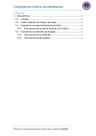 Este documento proporciona instrucciones sobre cómo usar Microsoft Word. Explica cómo insertar una hoja de cálculo de Excel, encabezados y pies de página en Word. También incluye un cuadro comparativo de las ventajas y desventajas de Word. El documento fue escrito por Xiomara Stefany Guerrero de la Rosa para un curso de informática en la Universidad Nacional de Chimborazo en Riobamba, Ecuador.