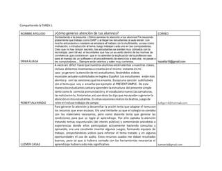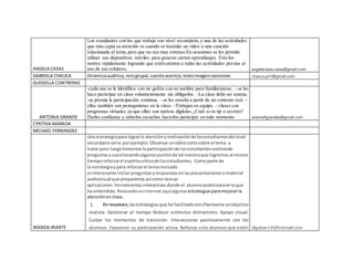 El documento contiene las respuestas de varios docentes a la pregunta "¿Cómo generas la atención de tus alumnos?". Los docentes describen estrategias como usar videos, canciones y juegos relacionados con los temas, involucrar a los estudiantes haciéndolos participar, y adaptar los materiales para hacerlos relevantes y atractivos para los estudiantes. También mencionan el uso de premios, trabajos en grupo y la integración de tecnología como formas de mantener la atención de los estudiantes.