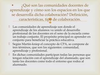Las comunidades docentes de aprendizaje son grupos formados por docentes y el entorno del alumnado cuyo objetivo principal es aprender de forma conjunta para mejorar la práctica educativa. Estas comunidades se caracterizan por el liderazgo compartido, la colaboración centrada en el aprendizaje, la investigación profesional y la confianza mutua entre sus miembros. Dentro de las comunidades docentes, la colaboración entre profesores puede ser profesional, cuando comparten contenidos y métodos de enseñanza, o conf