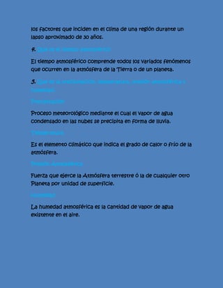 Las zonas polares se refieren a las áreas al norte y sur de los círculos polares ártico y antártico. La primavera y el verano son estaciones templadas del año, mientras que el clima se refiere al estado medio atmosférico de una región durante 30 años. El tiempo atmosférico incluye fenómenos como la precipitación, la temperatura, la presión atmosférica y la humedad.