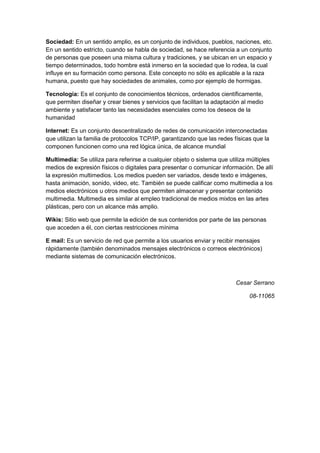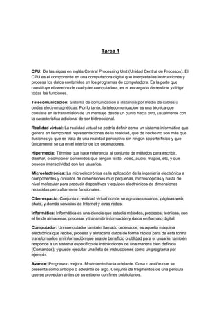El documento define varios términos clave relacionados con la tecnología. Define CPU como la unidad central de procesos de una computadora que interpreta instrucciones y procesa datos. Define la telecomunicación como la transmisión de mensajes a distancia por cables u ondas electromagnéticas de forma bidireccional. Define la realidad virtual como sistemas que generan representaciones interactivas de la realidad en tiempo real dentro de computadoras.