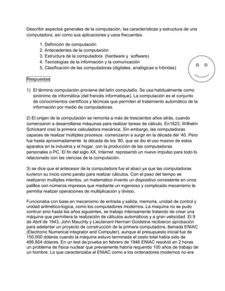 El documento describe los aspectos generales de la computación, incluyendo la definición, antecedentes, estructura de hardware y software, aplicaciones de las tecnologías de la información y comunicación, y las clasificaciones de computadoras digitales, analógicas e híbridas.