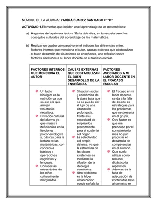 Este documento presenta un resumen de las actividades realizadas por una alumna de 6° grado sobre los factores que inciden en el aprendizaje de las matemáticas. Incluye un cuadro comparativo de factores internos y externos mencionados por el autor, así como factores asociados al fracaso escolar. También propone adecuaciones a la práctica docente para implementar la formación por competencias, como conocer los programas y estándares, realizar diagnósticos, y enfocarse en el desarrollo de habilidades más que