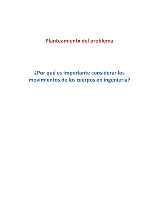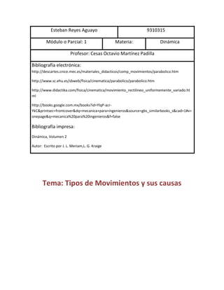 Este documento resume diferentes tipos de movimientos como el movimiento rectilíneo uniforme, movimiento rectilíneo uniformemente variado, movimiento parabólico y caída libre. Explica conceptos como velocidad, aceleración, fuerza y trayectorias. Además, incluye ecuaciones y ejemplos para ilustrar cada tipo de movimiento.
