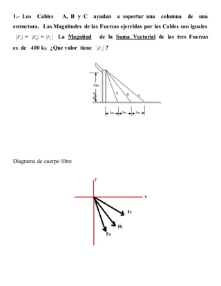 El documento presenta dos ejercicios de mecánica estática. El primero involucra tres cables (A, B, C) que sostienen una columna, donde la fuerza de cada cable es igual a 135.5 kN. El segundo ejercicio involucra hallar el ángulo entre dos vectores y calcular su producto vectorial.