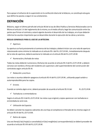 El documento habla sobre la importancia de llevar un control de obra a través de la bitácora. Explica que la bitácora es un medio legal de comunicación entre las partes involucradas en un proyecto de construcción. Además, define reglas generales para el uso de la bitácora e indica los asuntos que deben registrarse, como avances de obra, retrasos y modificaciones al programa. Por último, menciona diferentes tipos de reportes como físicos, financieros y fotográficos para dar seguimiento al progreso de la
