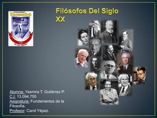El documento presenta información biográfica y académica breve de 20 filósofos importantes, incluyendo sus lugares y fechas de nacimiento, áreas de estudio, y contribuciones principales a la filosofía. Los filósofos incluidos son Ferdinand de Saussure, Sigmund Freud, Edmund Husserl, Martin Heidegger, Bertrand Russell, Ludwig Wittgenstein, Theodor Adorno, Max Horkheimer, Jean-Paul Sartre, Michel Foucault, Karl Popper, Jürgen Habermas, Simone de Beauvoir, Hannah Are