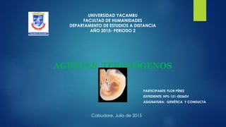 Los agentes teratógenos son cualquier elemento capaz de producir anomalías congénitas en el desarrollo del embrión o feto. Los períodos más críticos son cuando hay un rápido crecimiento celular. Los factores teratogénicos incluyen radiaciones, químicos como el alcohol y medicamentos, e infecciones biológicas como la rubéola, toxoplasmosis y sífilis.