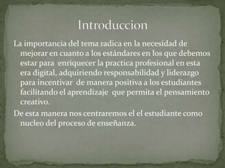 El documento describe los estándares nacionales de tecnología de la información y comunicación para docentes. Estos estándares buscan desarrollar 1) el aprendizaje y creatividad de los estudiantes, 2) experiencias de aprendizaje y evaluaciones propias de la era digital, 3) trabajo y aprendizaje características de la era digital, 4) ciudadanía digital y responsabilidad, y 5) crecimiento profesional y liderazgo. Los docentes deben facilitar e inspirar el aprendizaje de los estudiantes, diseñar experiencias