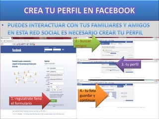 Crear una cuenta en Facebook requiere registrarse completando un formulario, luego buscar amigos y crear un perfil con foto e información personal, lo que permite chatear en línea y compartir actualizaciones a través de un muro y menús desplegables.