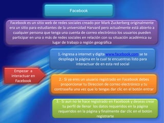 Facebook comenzó como un sitio para estudiantes de Harvard pero ahora está abierto a cualquier persona con una cuenta de correo. Los usuarios pueden conectarse y participar en redes relacionadas con su escuela, trabajo o región. El sitio permite que las personas creen perfiles, encuentren amigos, compartan fotos y mensajes, y se comuniquen online.