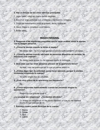 Este documento presenta varios ejercicios para el autoconocimiento y la evaluación de la imagen personal. El primer ejercicio pide al lector que identifique 5 conductas positivas y negativas propias. Luego pide hacer un listado de 5 talentos principales. El segundo ejercicio contiene preguntas sobre cómo se siente el lector con su imagen y apariencia física. Finalmente, el tercer ejercicio propone realizar un cuadro con la ayuda de otra persona para sincerar la imagen que proyecta hacia los demás.