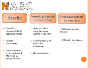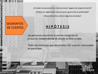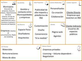 Este documento presenta una propuesta para crear y mejorar espacios públicos a través de la colaboración entre municipalidades y empresas privadas. La solución consiste en generar plazas y paraderos temáticos financiados por privados, lo que beneficiaría a los usuarios y daría publicidad a las empresas. El modelo de negocios se enfocaría en vender este servicio a empresas interesadas en responsabilidad social empresarial.