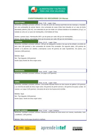 Este documento presenta el resumen de 24 horas de alimentos y bebidas consumidos por una persona, incluyendo el desayuno a las 7:30 am en casa con zumo de naranja, cacao en leche y tostada. La comida a las 3:15 pm en casa consistió en espaguetis con atún, salmón a la plancha y manzana. La merienda a las 6 pm fue un yogur. La cena a las 9:30 pm en casa incluyó tortilla francesa con jamón y queso, nueces y otro yogur. También consum
