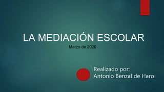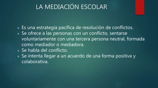 La mediación escolar es una estrategia pacífica para resolver conflictos de forma voluntaria con la ayuda de un mediador neutral. El proceso involucra a las partes en conflicto hablando del problema y tratando de llegar a un acuerdo positivo. La mediación es importante en las escuelas porque mejora el clima, las habilidades sociales y reduce los conflictos y sanciones.
