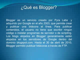El documento define Web 2.0 como un cambio de paradigma en Internet que abandona su unidireccionalidad para facilitar la máxima interacción entre usuarios y el desarrollo de redes sociales. Blogger es un servicio creado por Google que permite crear y publicar blogs en línea sin necesidad de escribir código. Un wiki es un sitio web cuyas páginas pueden ser editadas por múltiples voluntarios a través del navegador, permitiendo que los usuarios creen, modifiquen o borren texto compartido de forma colab