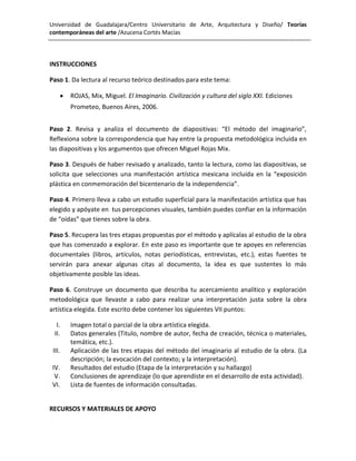 Este documento presenta una actividad para analizar una obra artística mexicana de la Exposición plástica en conmemoración del bicentenario de la independencia de México usando el método del imaginario. Los estudiantes deben seleccionar una obra, aplicar las tres etapas del método - descripción, evocación del contexto e interpretación - y producir un documento que incluya una imagen de la obra, datos generales, el análisis usando las etapas del método y conclusiones sustentadas por fuentes. El objetivo es identificar
