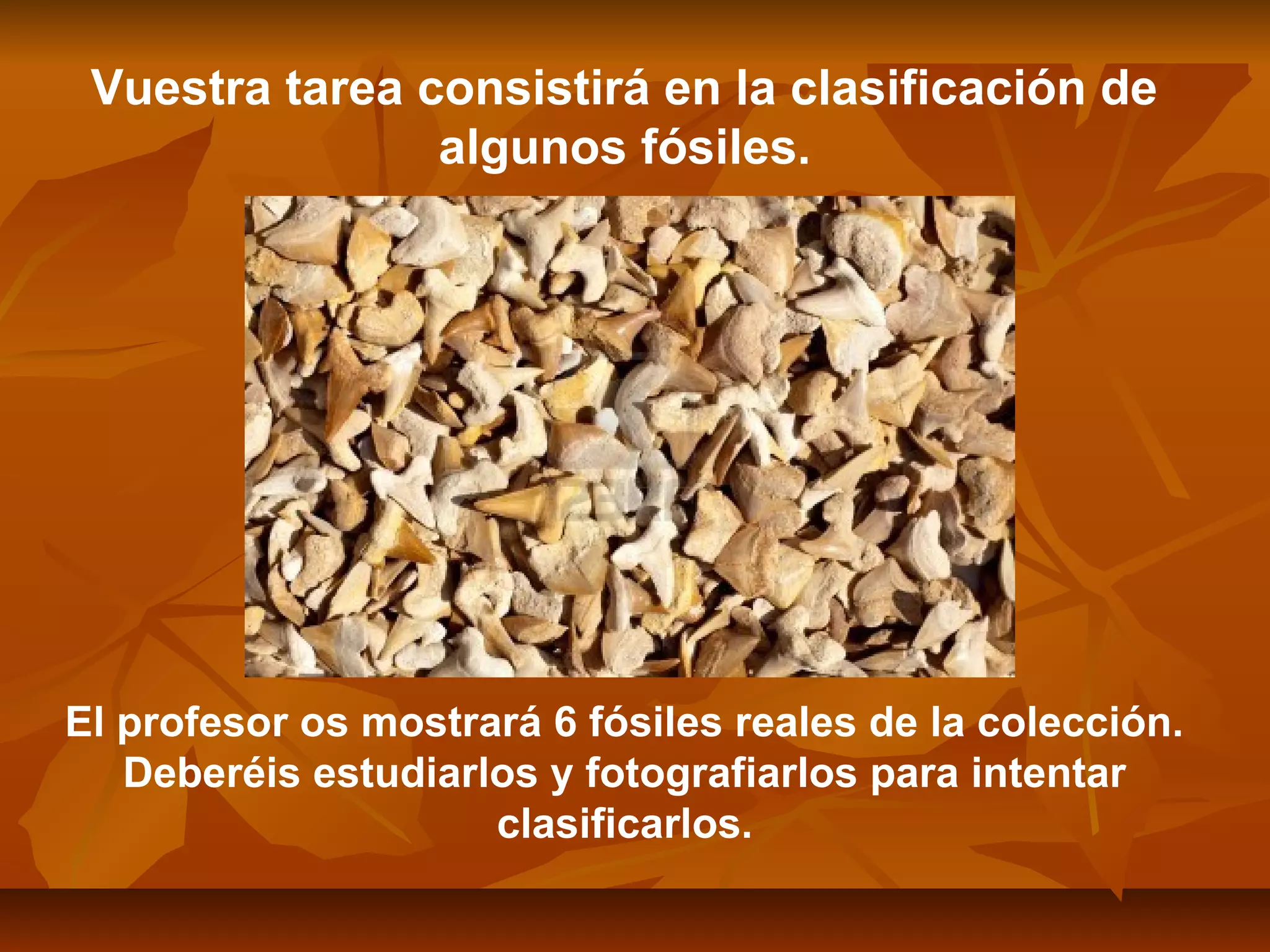 Los estudiantes trabajarán en grupos para clasificar 6 fósiles reales de la colección del profesor, estudiar y fotografiar cada fósil y completar una ficha con información sobre cada uno para volver a organizarlos en las estanterías.