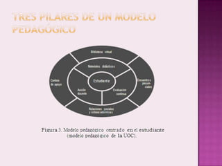 Este documento describe diferentes modelos de aprendizaje, incluyendo modelos centrados en los medios, profesores y estudiantes. También discute los beneficios de los entornos de aprendizaje no presenciales como la flexibilidad y acceso a recursos en línea. El objetivo es integrar estos modelos para que cada uno contribuya al aprendizaje y el estudiante sea el protagonista con el apoyo de un profesor guía.
