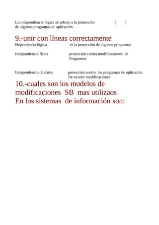 El documento describe tres modelos de bases de datos: el modelo relacional, el modelo jerárquico y el modelo de red. Explica que el modelo relacional sirve para modelar problemas reales y administrar datos dinámicamente, mientras que el modelo jerárquico almacena la información de forma jerárquica y el modelo de red permite que un nodo tenga varios padres. También menciona la independencia física, lógica y de datos.