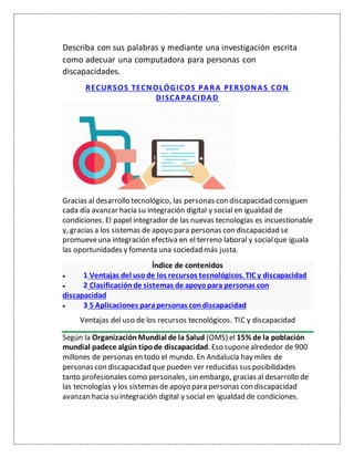 El documento describe los recursos tecnológicos disponibles para personas con discapacidad. Explica que las tecnologías de la información y la comunicación (TIC) mejoran la autonomía, autoestima e integración de las personas con discapacidad. Describe diferentes sistemas de apoyo como sistemas alternativos y aumentativos de comunicación, tecnologías de acceso al ordenador y aplicaciones móviles para discapacidades específicas.