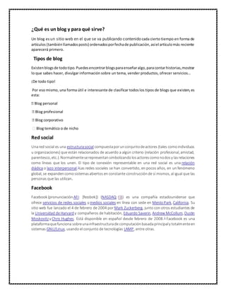 Un blog es un sitio web donde se publica contenido de forma periódica en forma de artículos ordenados por fecha. Existen blogs personales, profesionales, corporativos y temáticos. Las redes sociales como Facebook, Instagram, Twitter y WhatsApp permiten compartir contenido y conectarse con otros. Plataformas como YouTube, SlideShare y Prezi permiten compartir videos, presentaciones y otros archivos.