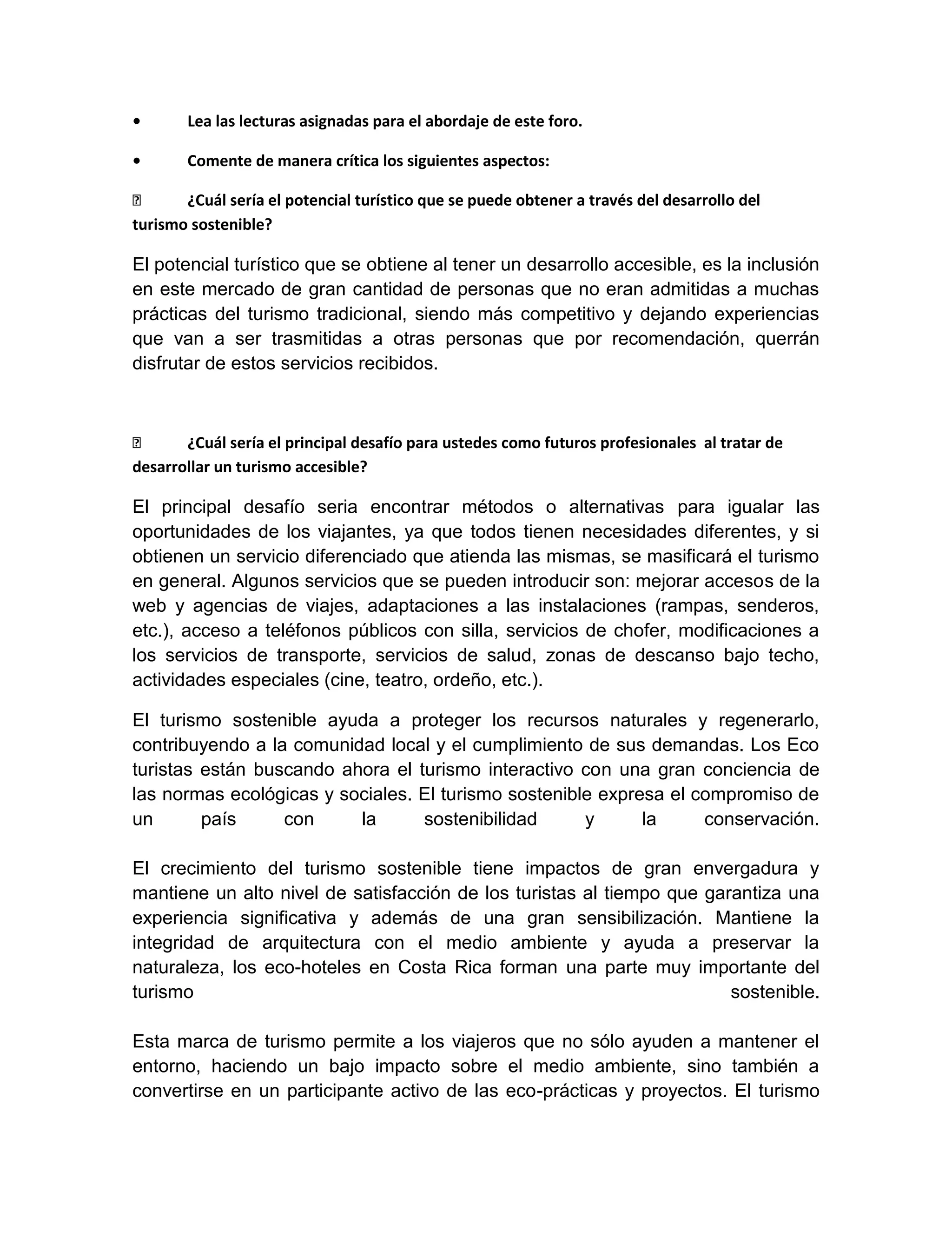 El documento discute el potencial del turismo sostenible para incluir a más personas y ser más competitivo, así como los desafíos de brindar oportunidades iguales a viajeros con necesidades diferentes. También analiza la importancia económica del turismo sostenible para proteger los recursos naturales y satisfacer a los turistas, y concluye que aunque la Ley 7600 establece un marco, se necesita iniciativa de las empresas turísticas para satisfacer plenamente las necesidades de los visitantes.
