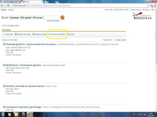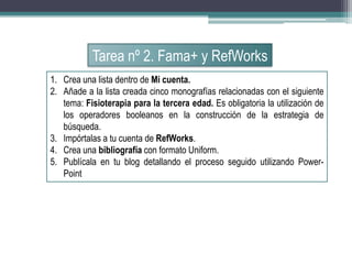 Este documento describe una tarea que involucra el uso de las bases de datos Fama+ y RefWorks. La tarea requiere que el estudiante cree una lista de cinco monografías relacionadas con la fisioterapia para la tercera edad utilizando operadores booleanos. Luego, las monografías deben importarse a una cuenta de RefWorks y crear una bibliografía con formato Uniform para publicarla en un blog, detallando el proceso en PowerPoint.