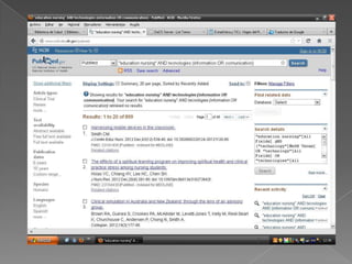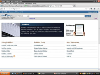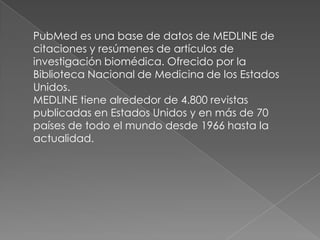 PubMed es una base de datos de MEDLINE que contiene citaciones y resúmenes de artículos de investigación biomédica de más de 4,800 revistas médicas desde 1966. La base de datos es ofrecida por la Biblioteca Nacional de Medicina de Estados Unidos.