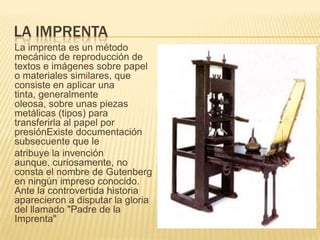 El documento resume la evolución de los medios de comunicación desde la imprenta de Gutenberg hasta la prensa escrita moderna y la telefonía móvil. Describe cómo la imprenta revolucionó la reproducción de textos e imágenes, y cómo inventos posteriores como el telégrafo, el teléfono y los celulares han transformado la comunicación a lo largo de la historia. También explica el desarrollo del periodismo y los periódicos impresos como un medio fundamental de informar al público.