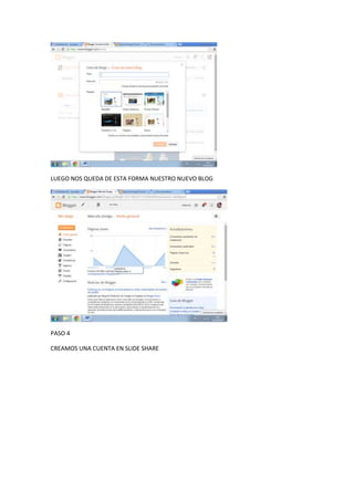 El documento proporciona 7 pasos para crear un blog, que incluyen abrir una cuenta de Gmail, usar la aplicación Blogger para crear un nuevo blog, crear una cuenta en SlideShare para subir documentos, y pegar el enlace de un documento subido en el blog recién creado.