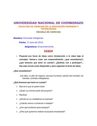 Este documento presenta una tarea sobre el emprendimiento. Propone una lluvia de ideas sobre lo que se necesita para crear un negocio, incluyendo una idea, un plan de negocios, recursos humanos y un estudio de mercado. También se debe considerar quién formará parte del proyecto, dónde y cuándo se establecerá la empresa, y con qué recursos se contará inicialmente. La tarea también pide pensar en cuál de los factores involucrados en la creación de un negocio es el más importante, a lo que la respuesta es la