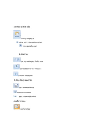 Este documento presenta las diferentes barras, botones y herramientas de una interfaz de usuario de software de oficina estándar. Describe las funciones básicas de la barra de título, la barra de herramientas de acceso rápido, el área de trabajo, la barra de estado, la barra de desplazamiento y los botones Minimizar, Maximizar y Cerrar. Además, explica brevemente las funciones de insertar, diseñar páginas, referencias, correspondencia, revisar y vista disponibles a través de la c