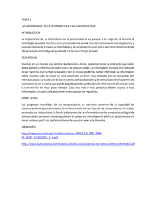 La informática es importante para la jurisprudencia porque permite nuevas investigaciones y técnicas de estudio que ayudan a un futuro mejor. La tecnología permite almacenar y transmitir grandes cantidades de información personal, lo que plantea desafíos para la privacidad y la regulación. El progreso de la informática, incluida la inteligencia artificial, apoya un alto nivel de profesionalismo en carreras legales.