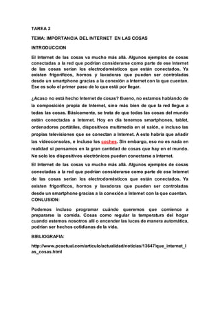 El documento describe la importancia creciente de Internet de las Cosas, donde dispositivos cotidianos como electrodomésticos, vehículos y más están conectados a Internet. Actualmente existen refrigeradores, hornos y lavadoras controlables desde teléfonos inteligentes, pero en el futuro todo tipo de objetos estarán conectados. Esto permitirá controlar y automatizar tareas del hogar como la temperatura y las luces desde cualquier lugar.