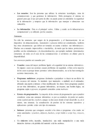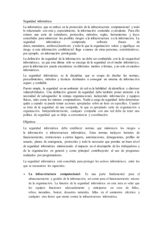 La seguridad informática se enfoca en proteger la infraestructura tecnológica y la información de una organización de amenazas internas y externas mediante el establecimiento de normas, procedimientos y técnicas de seguridad. Las amenazas pueden provenir de usuarios, programas maliciosos, errores, intrusos, desastres o fallas y buscan robar, destruir o alterar información. La ingeniería social, que manipula psicológicamente a los usuarios, también representa una seria amenaza.