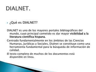El documento describe cómo realizar una búsqueda en la base de datos DIALNET. Explica que DIALNET es un portal bibliográfico que da visibilidad a la literatura científica hispana, centrándose en las ciencias humanas, jurídicas y sociales. Detalla los pasos para acceder a DIALNET desde la biblioteca de la Universidad de Sevilla y realizar una búsqueda utilizando palabras clave y operadores booleanos para encontrar artículos sobre el uso de blogs y redes sociales en la enseñanza y el aprendizaje de enfer