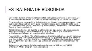 El documento describe una estrategia de búsqueda en Dialnet para encontrar artículos relacionados con el uso de blogs y redes sociales en la docencia y el aprendizaje en enfermería. La estrategia incluye identificar las palabras clave principales y el uso de operadores booleanos para una búsqueda efectiva. La búsqueda arrojó 11 artículos totales, con 7 escritos en los últimos 5 años. Aunque un artículo de interés no estaba disponible completo en Dialnet, se podía acceder al texto completo a través del cat