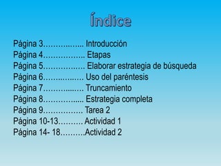 Este documento presenta una introducción al seminario sobre estrategia de búsqueda bibliográfica. Explica las etapas para elaborar una estrategia de búsqueda efectiva y los operadores booleanos y truncamiento que se pueden utilizar. También incluye dos actividades prácticas sobre cómo realizar búsquedas en la base de datos Dialnet y cómo acceder al texto completo de documentos a través de la biblioteca universitaria cuando Dialnet solo muestra resúmenes.
