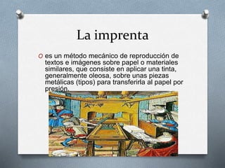 El documento describe la historia de la imprenta y el telégrafo. Explica que Gutenberg inventó la imprenta moderna usando tipos móviles de metal para imprimir copias más rápidas de la Biblia. También describe los primeros experimentos con la electricidad que llevaron al desarrollo del telégrafo, incluyendo los trabajos de Volta, Oersted, Schweigger y Henry, culminando con los sistemas prácticos de Cooke y Wheatstone.