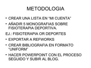 Este documento describe los pasos para crear una bibliografía sobre fisioterapia deportiva utilizando RefWorks. Incluye buscar 5 monografías sobre el tema en el catálogo FAMA, añadirlas a una lista en RefWorks, exportar la lista a RefWorks, y crear una bibliografía en formato uniforme para incluir en una presentación de PowerPoint sobre el proceso.