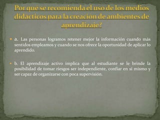 2. Los medios tecnológicos comprenden audiovisuales, informáticos y TIC como el correo electrónico y la videoconferencia.
