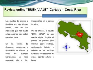 La revista digital 'Buen Viaje' está dirigida al público general y proporciona información sobre destinos turísticos en Costa Rica, destacando su biodiversidad y la calidad de servicios ofrecidos. A pesar de la alta competencia en el sector turístico, el país tiene ventajas comparativas, como su cercanía a mercados importantes y su estabilidad política. La publicación busca mejorar sus estrategias de marketing y servicios, adaptándose a un mercado globalizado y digitalizado para atraer y satisfacer al turista potencial.