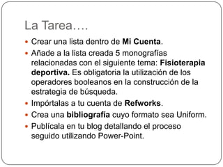 Este documento describe las instrucciones para una tarea sobre competencias informacionales en ciencias de la salud. La tarea implica crear una lista en Mi Cuenta con 5 monografías sobre fisioterapia deportiva utilizando operadores booleanos, importarlas a RefWorks, crear una bibliografía en formato Uniform, y publicarla en un blog con PowerPoint detallando el proceso.