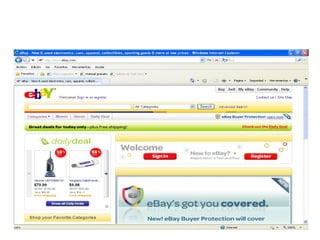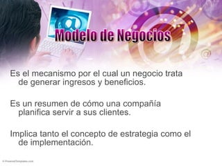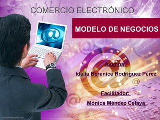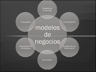 El documento describe varios modelos de negocios para el comercio electrónico, incluyendo franquicias, publicidad, intermediación, suscripción y sindicación de contenidos. También explica los tipos de comercio electrónico como B2B, B2C, B2A, C2C, C2B y C2A.