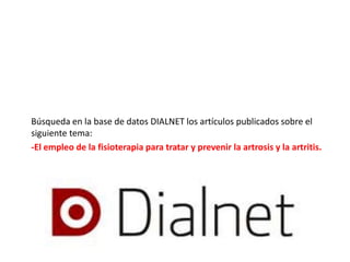 El documento describe los pasos para realizar una búsqueda en la base de datos Dialnet sobre el uso de la fisioterapia para tratar y prevenir la artrosis y la artritis. Incluye los términos de búsqueda utilizados, la lista de documentos encontrados y los pasos para acceder al texto completo de uno de los artículos.