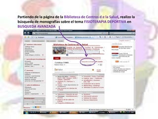 El documento proporciona instrucciones para realizar una búsqueda avanzada en la biblioteca de centros de salud sobre el tema de fisioterapia deportiva, seleccionar 8 resultados relevantes, guardarlos en una lista nueva titulada "Fisioterapia Deportiva", y exportar los títulos seleccionados a RefWorks para crear una bibliografía en formato uniforme.