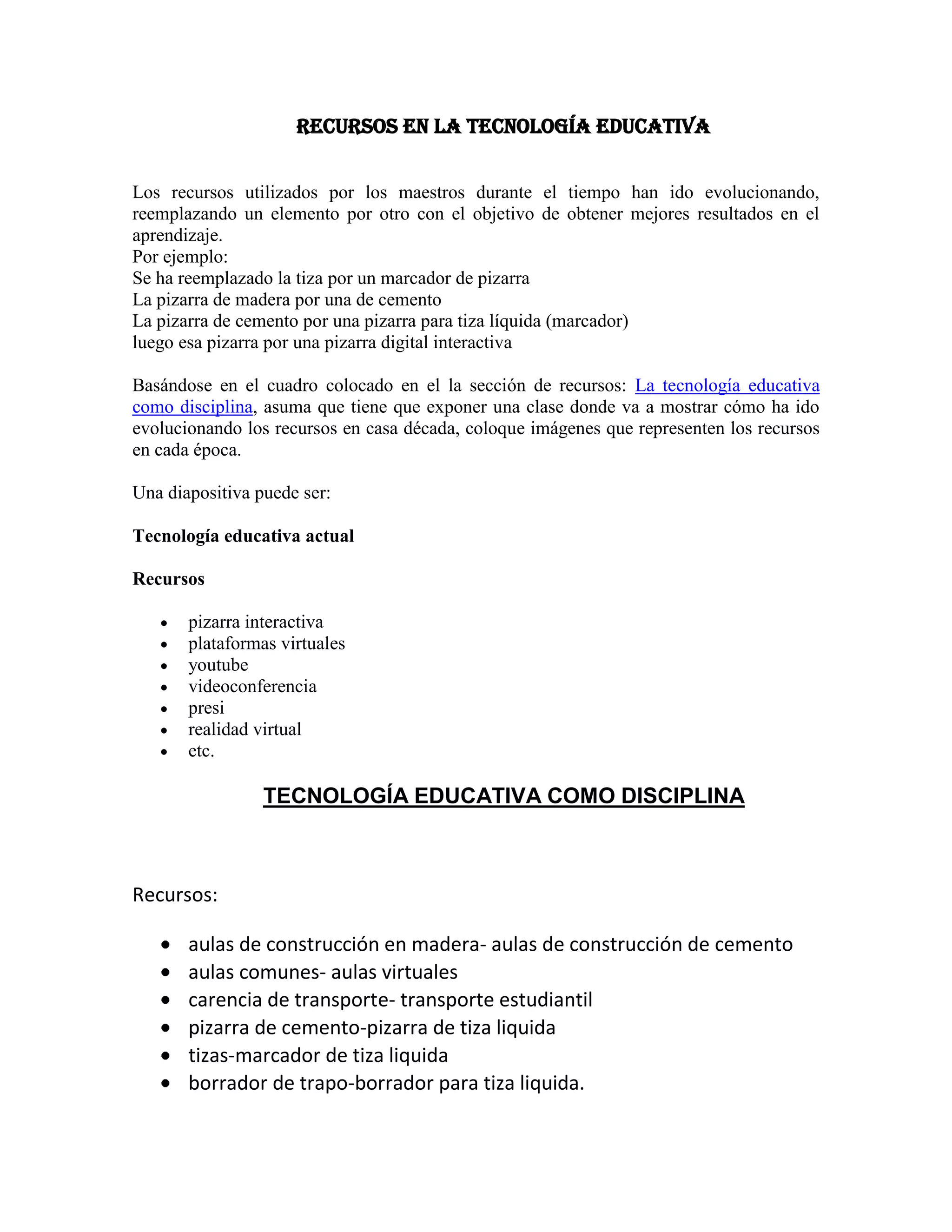 El documento describe la evolución de los recursos tecnológicos utilizados en la educación a través de las décadas, incluyendo el reemplazo de pizarras de madera y tiza por pizarras digitales interactivas y plataformas virtuales. También destaca el cambio de aulas de madera a aulas virtuales y el uso creciente de recursos como Internet y YouTube para mejorar la enseñanza de manera más rápida y eficiente.