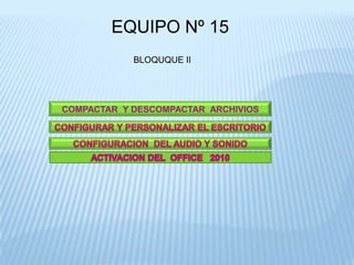 El documento explica la importancia de compactar y descompactar archivos para optimizar el espacio en disco y la eficiencia de la PC, además de detallar los programas como WinRAR y WinZip para estas funciones. También aborda el funcionamiento básico de la configuración de audio en una PC y la activación de Microsoft Office 2010, incluyendo la necesidad de desactivar el antivirus durante el proceso de activación. Se proporcionan pasos detallados para la compresión y descompresión de archivos, así como para la configuración de audio y sonido.