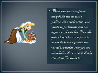 Cenicienta, una joven huérfana que trabaja como sirvienta para su madrastra y sus dos hermanastras, asiste a un baile real gracias a la intervención de su Hada Madrina. En el baile, Cenicienta cautiva al Rey pero debe huir antes de la medianoche, perdiendo uno de sus zapatos. El Rey busca a la joven que calce el zapato para casarse con ella, y finalmente la encuentra en Cenicienta.